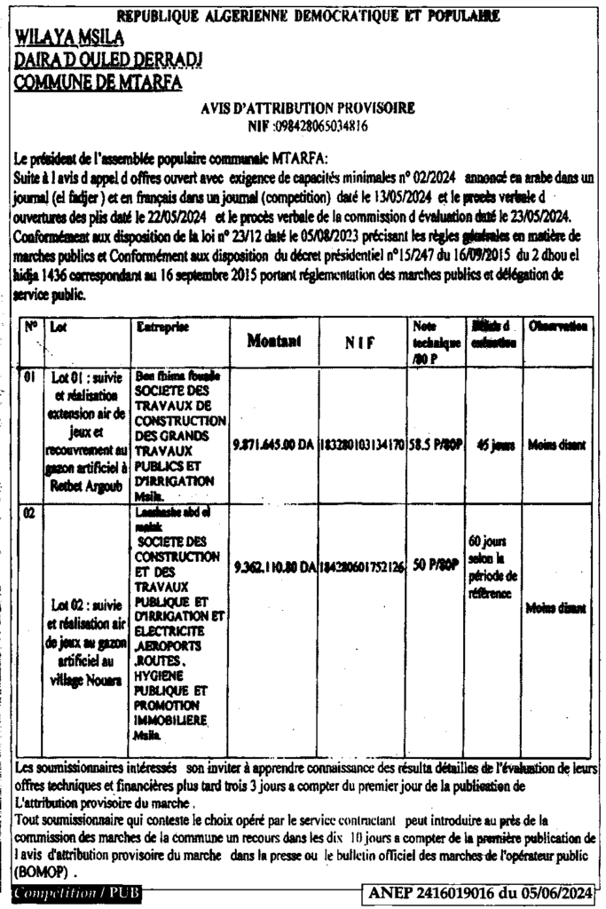 إعلان عن المنح المؤقت بلدية مطارفة