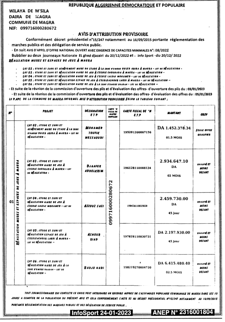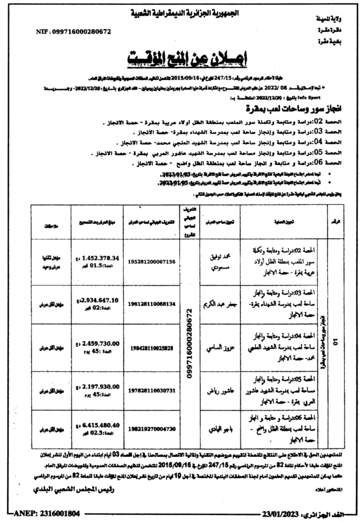 طلب العروض المفتوح مع اشتراط قدرات دنيا المتعلقة بـ : انجاز سور وساحات لعب بمقرة23 يناير، 20230 22 شاركها فيسبوك X مشاركة عبر البريد طباعة