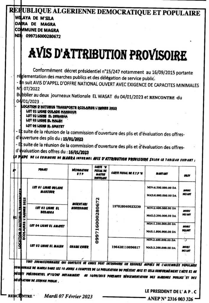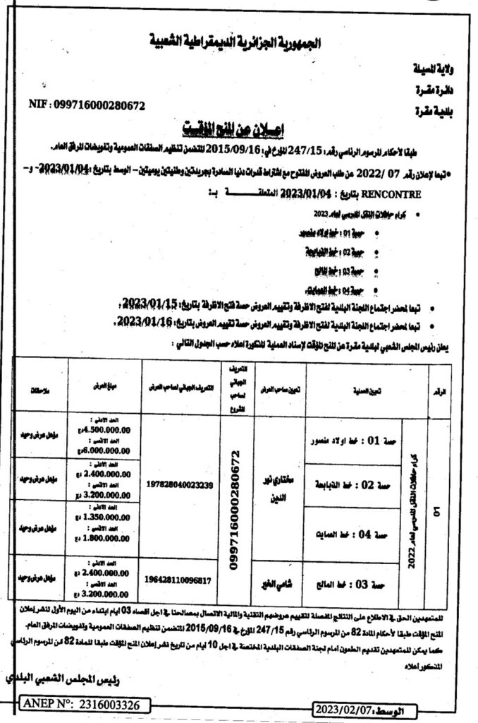 إعلان عن المنح المؤقت/ بلدية مقرة