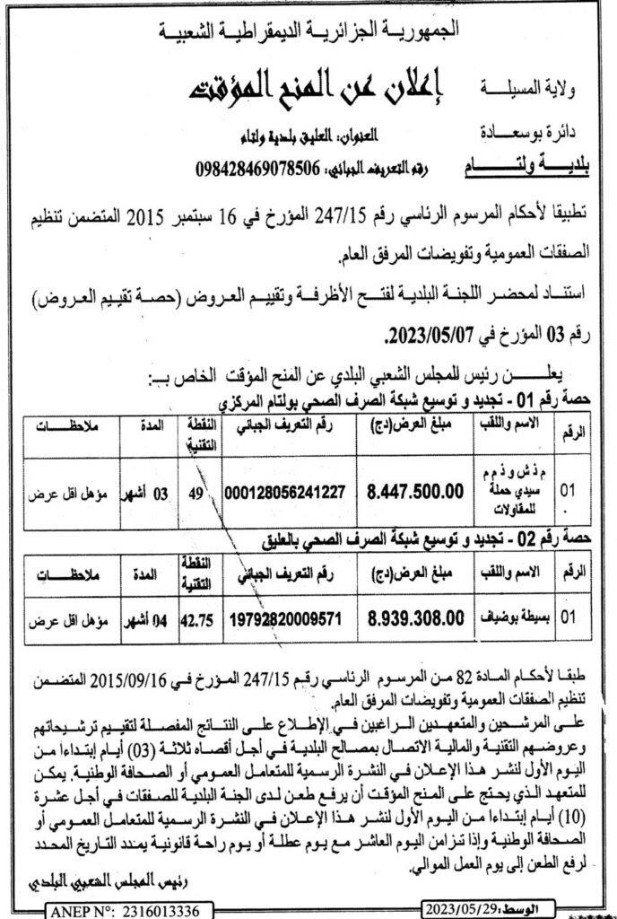 إعلان عن المنح المؤقت/ بلدية ولتام