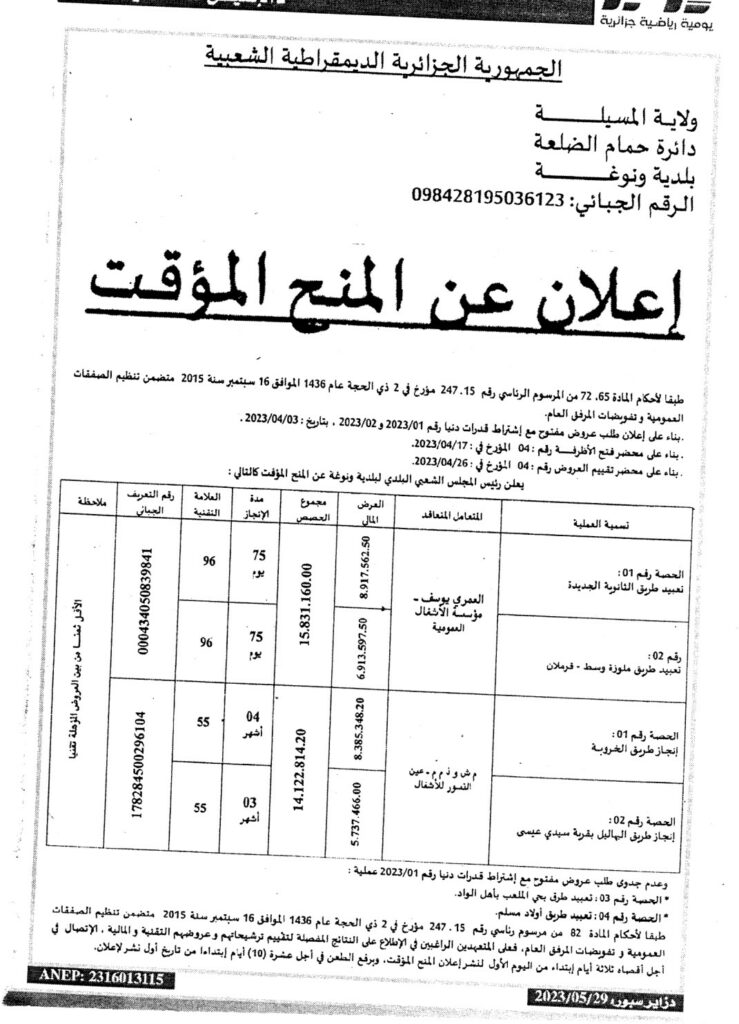 إعلان عن المنح المؤقت/ بلدية ونوغة
