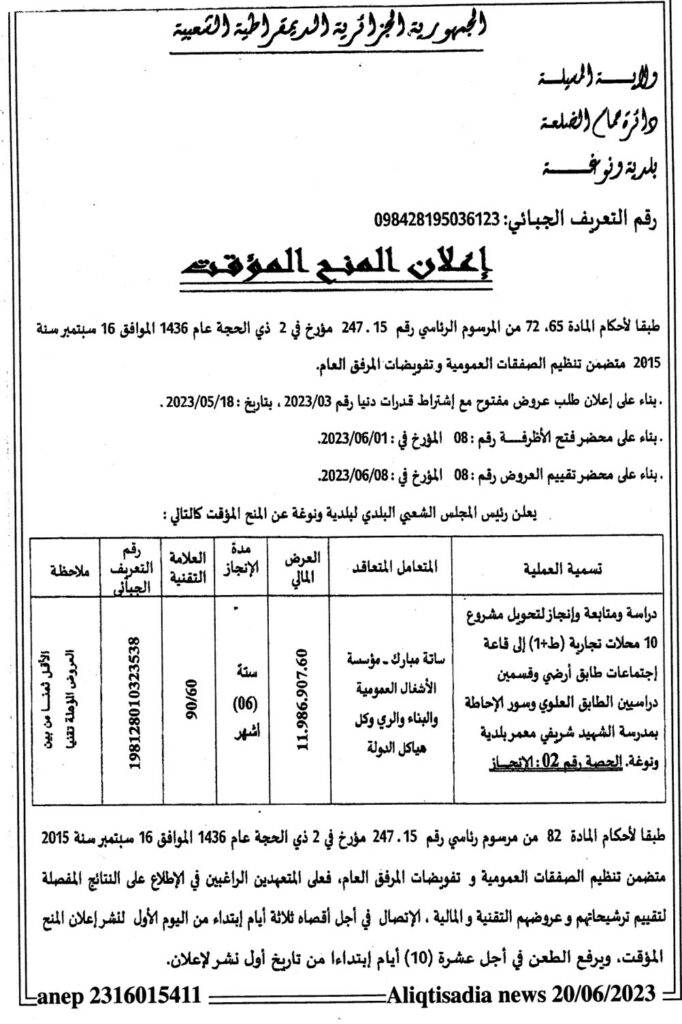 إعلان عن المنح المؤقت/ بلدية ونوغة
