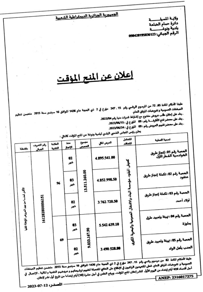 إعلان عن المنح المؤقت/ بلدية ونوغة