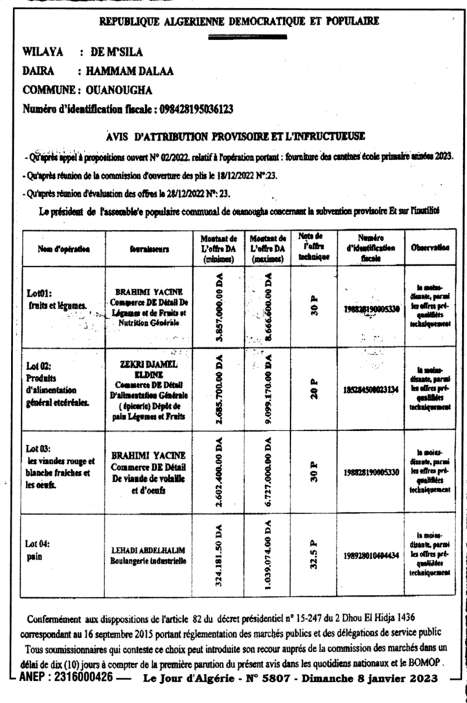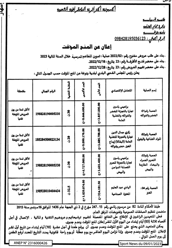 طلب عروض مفتوح 2022/02 عملية: تموين المطاعم المدرسية خلال السنة المالية 20238 يناير، 20230 14 شاركها فيسبوك X مشاركة عبر البريد طباعة