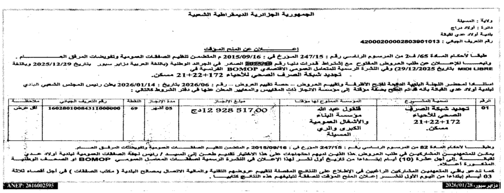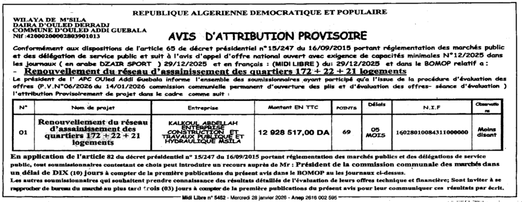 إعلان عن المنح المؤقت تجديد شبكة الصرف الصحي/ بلدية أولاد عدي لقبالة