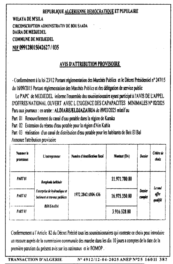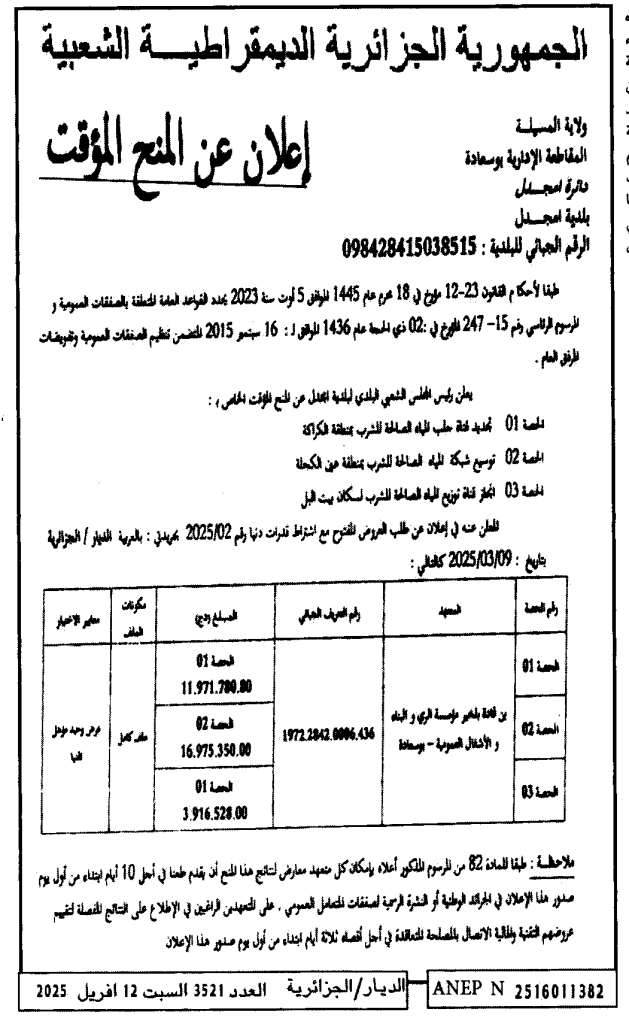 إعلان عن المنح المؤقت تجديد وتوسيع وانجاز شبكة المياه الصالحة للشرب/ بلدية امجدل