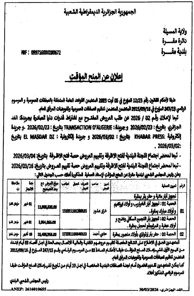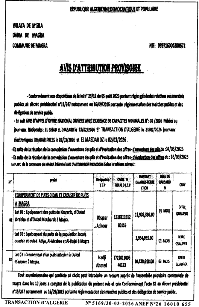إعلان عن المنح المؤقت تجهيز آبار مائية وحفر بئر بمقرة/ بلدية مقرة
