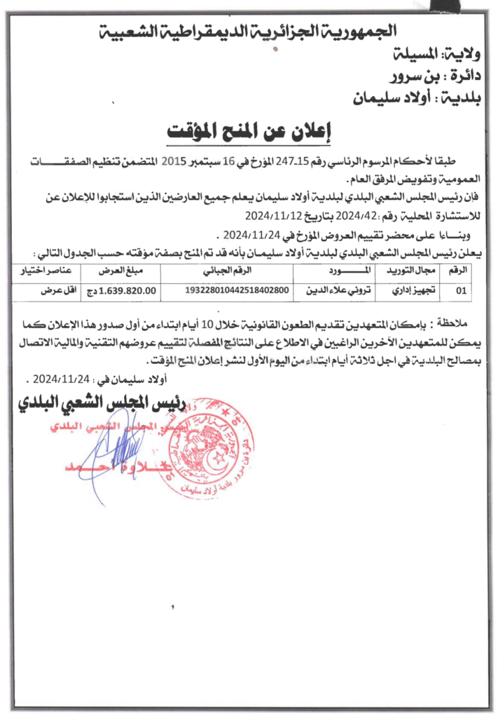إعلان عن المنح المؤقت تجهيز إداري/ بلدية أولاد سليمان