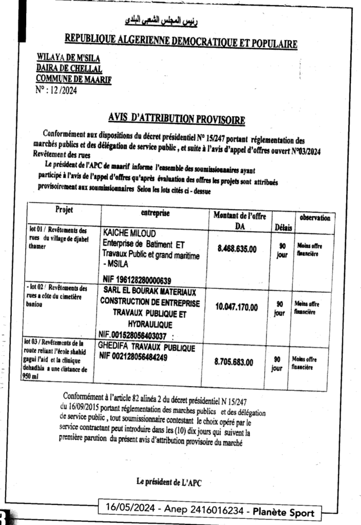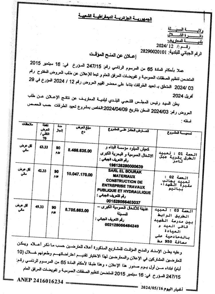 إعلان عن المنح المؤقت تعبيد الطرقات/ بلدية المعاريف