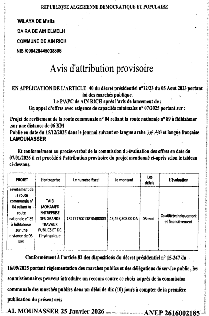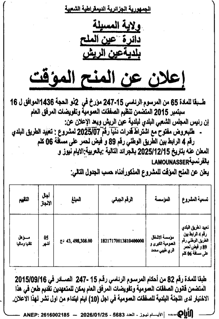 إعلان عن المنح المؤقت تعبيد الطريق البلدي/ بلدية عين الريش