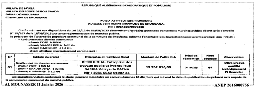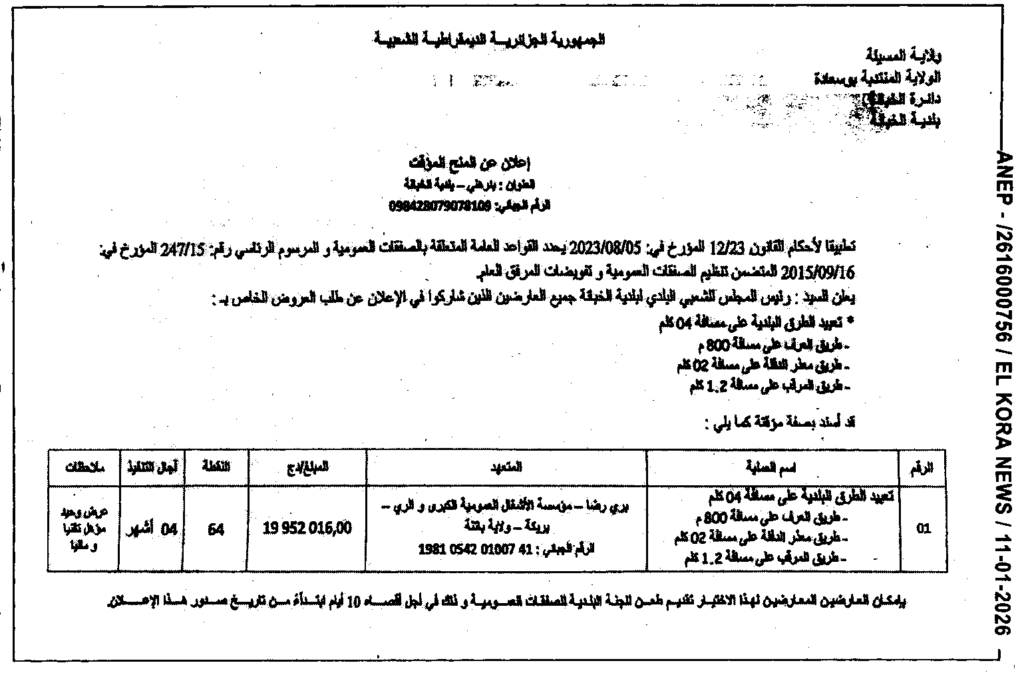 إعلان عن المنح المؤقت تعبيد طرق البلدية/ بلدية الخبانة