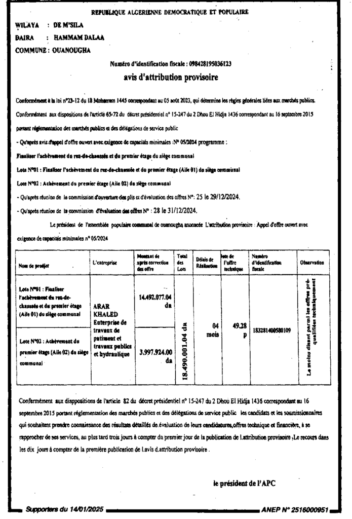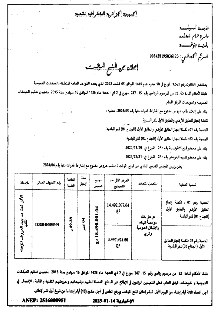 إعلان عن المنح المؤقت تكملة انجاز الطابق الأرضي والطابق الأول لمقر بلدية ونوغة