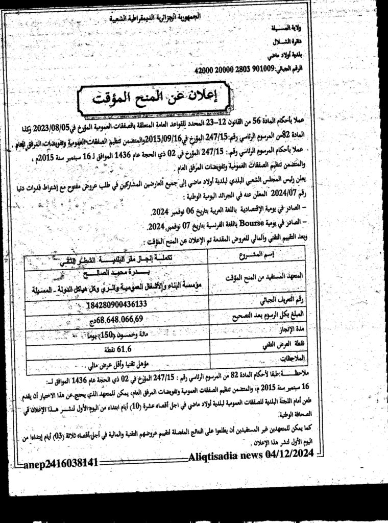 إعلان عن المنح المؤقت تكملة انجاز مقر البلدية الشطر الثاني/ بلدية أولاد ماضي