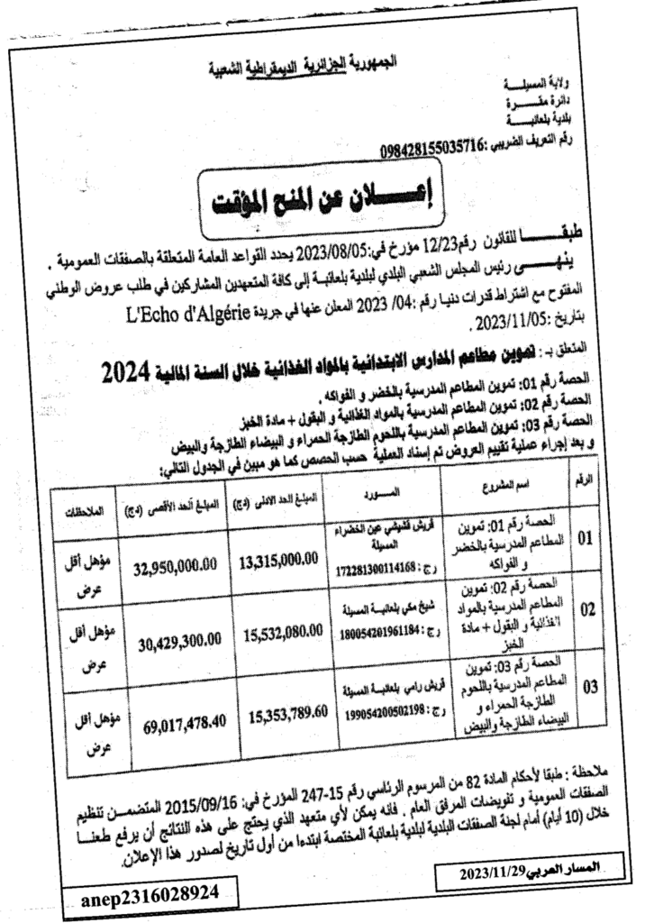 إعلان عن المنح المؤقت: تموين مطاعم المدارس الابتدائية خلال السنة المالية 2024 بلدية بلعايبة