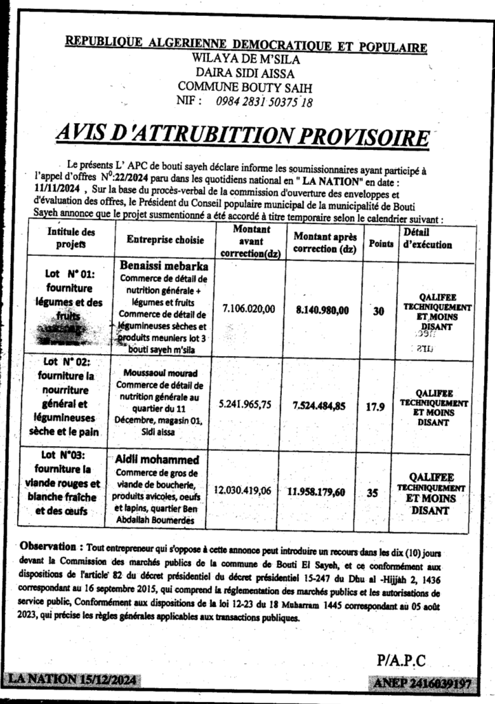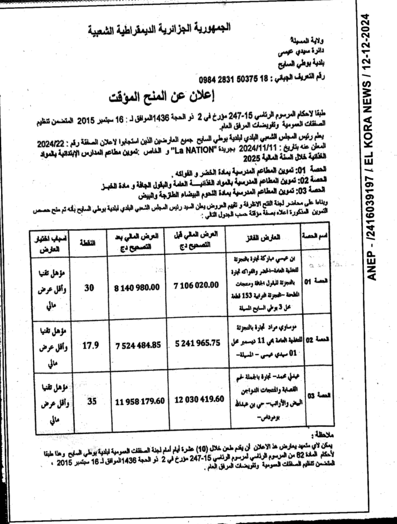إعلان عن المنح المؤقت تموين مطاعم المدارس الابتدائية بالمواد الغذائية خلال السنة المالية 2025/ بلدية بوطي السايح