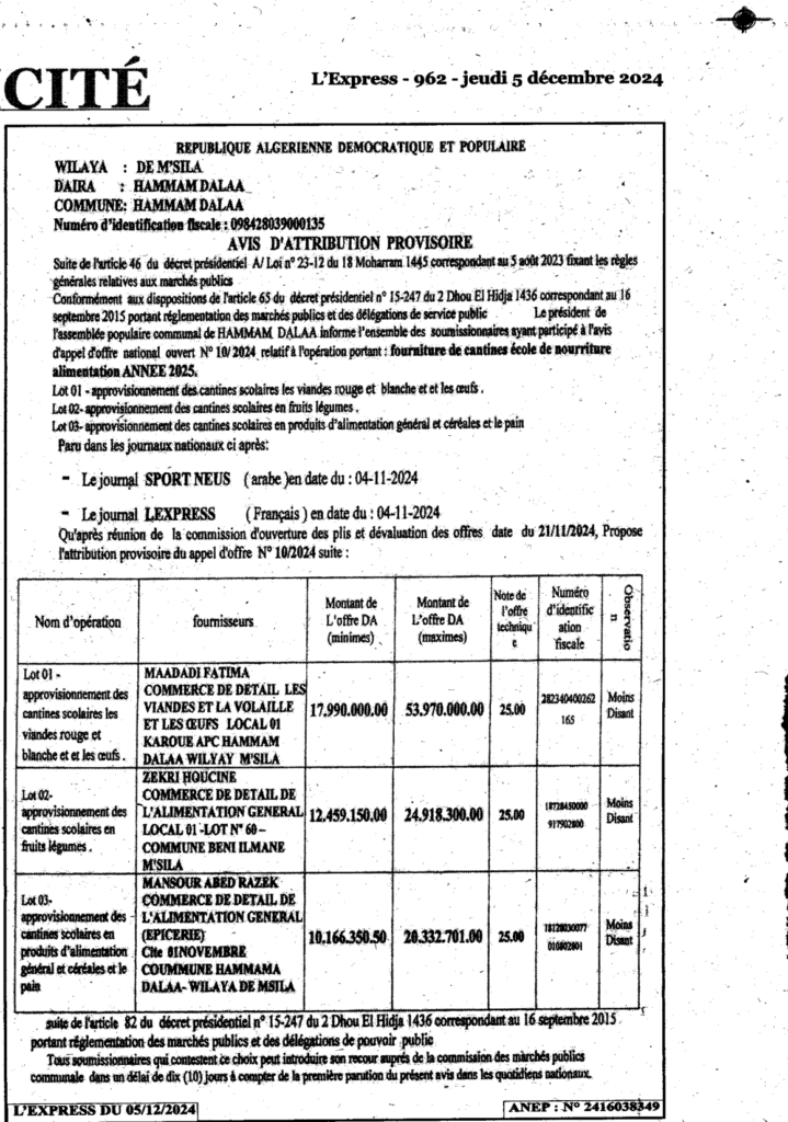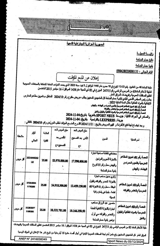 إعلان عن المنح المؤقت تموين مطاعم المدارس الابتدائية بالمواد الغذائية خلال السنة المالية 2025/ بلدية حمام الضلعة