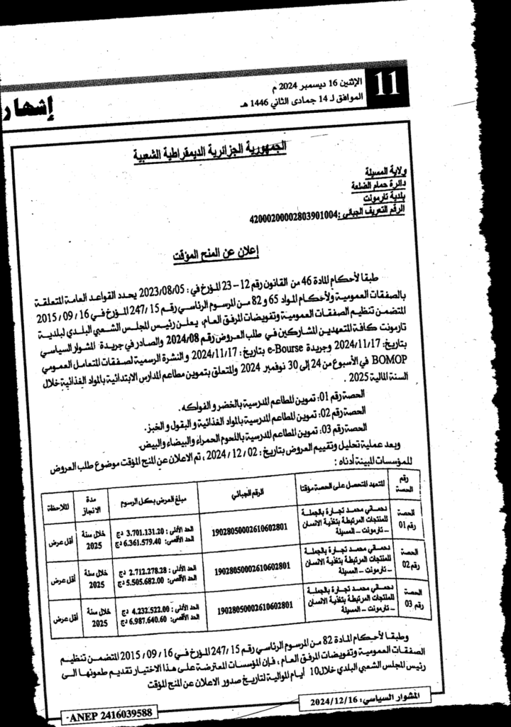 إعلان عن المنح المؤقت تموين مطاعم المدارس الابتدائية بالمواد الغذائية لسنة 2025/ بلدية تارمونت