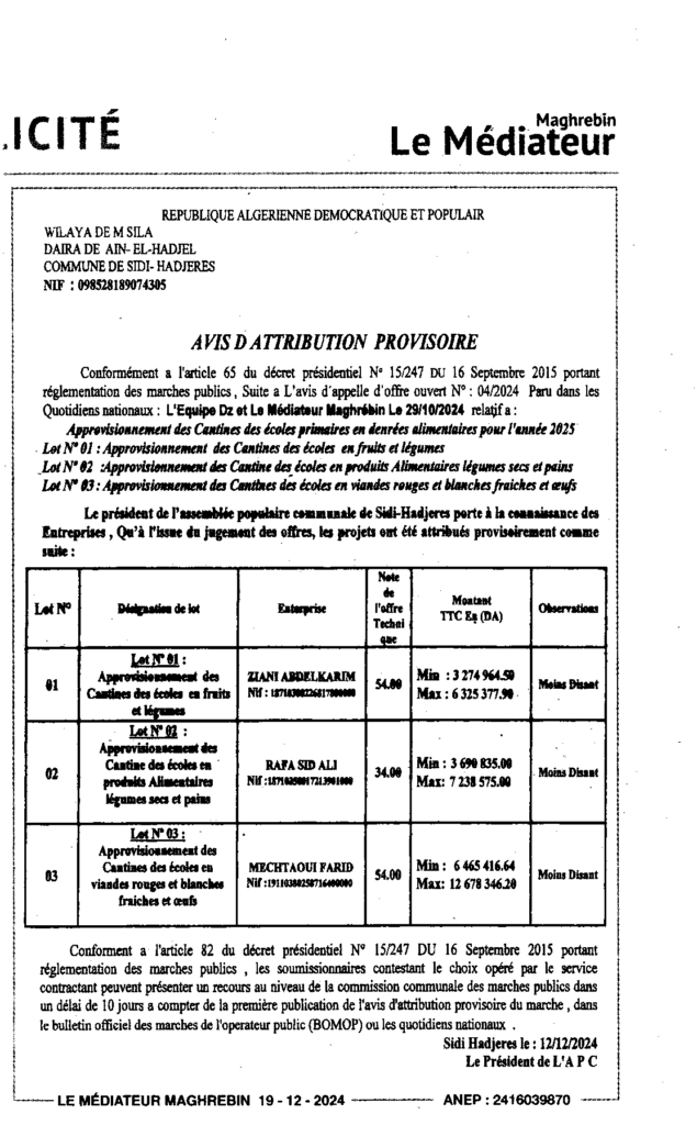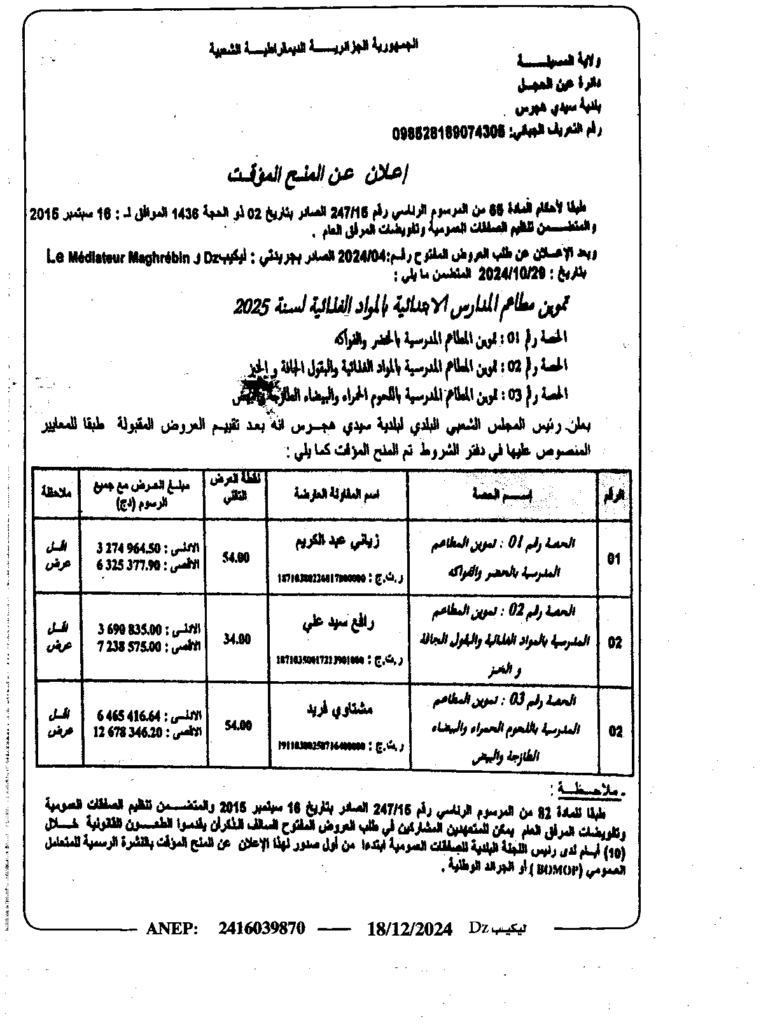 إعلان عن المنح المؤقت تموين مطاعم المدارس الابتدائية بالمواد الغذائية لسنة 2025/ بلدية سيدي هجرس
