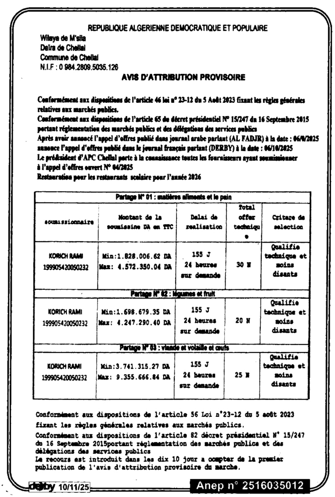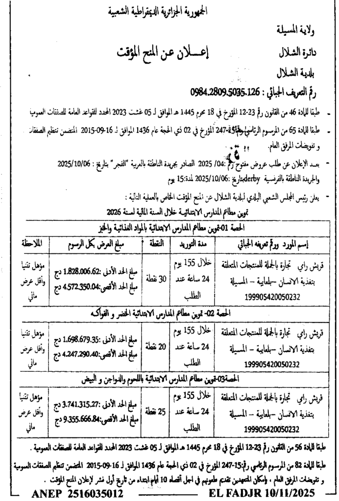 إعلان عن المنح المؤقت تموين مطاعم المدارس الابتدائية بالمواد الغذائية/ بلدية الشلال