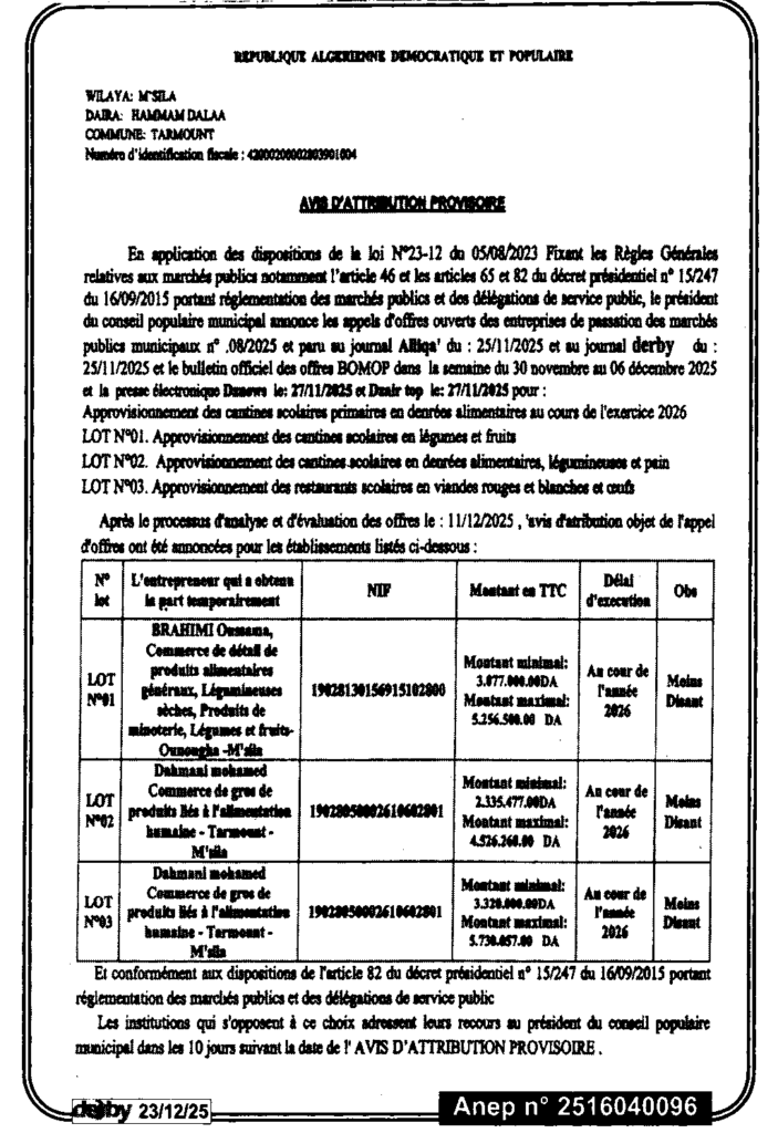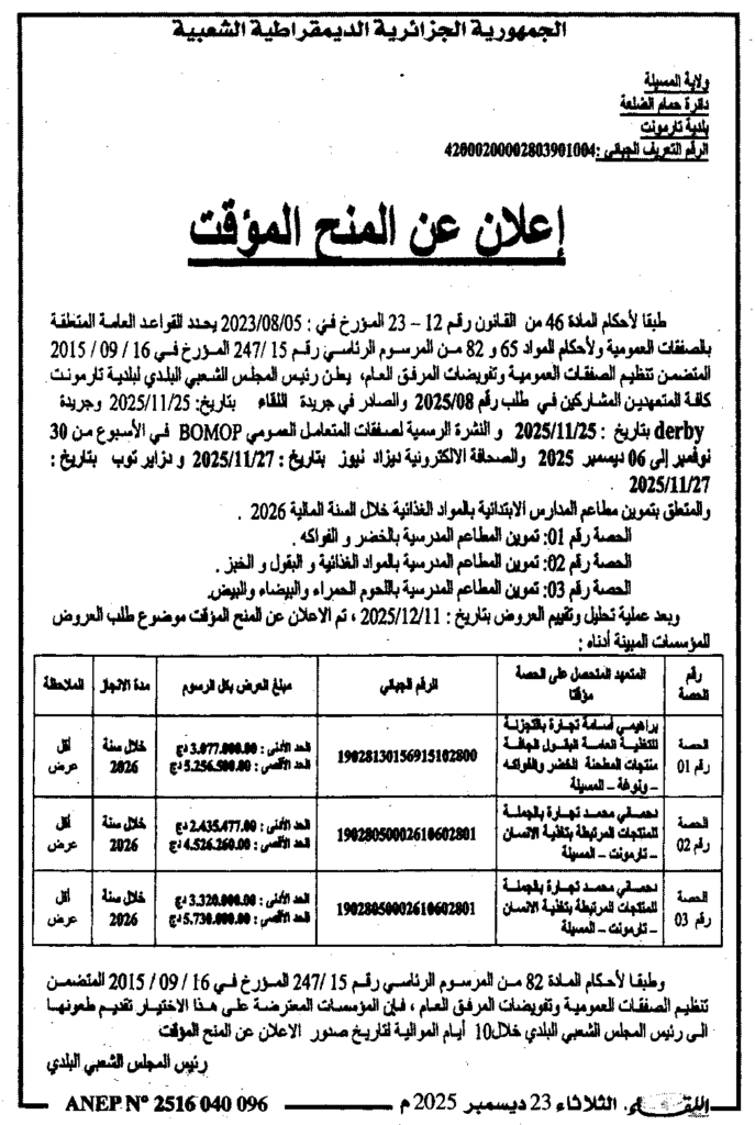 إعلان عن المنح المؤقت تموين مطاعم المدارس الابتدائية بالمواد الغذائية 2026/ بلدية تارمونت