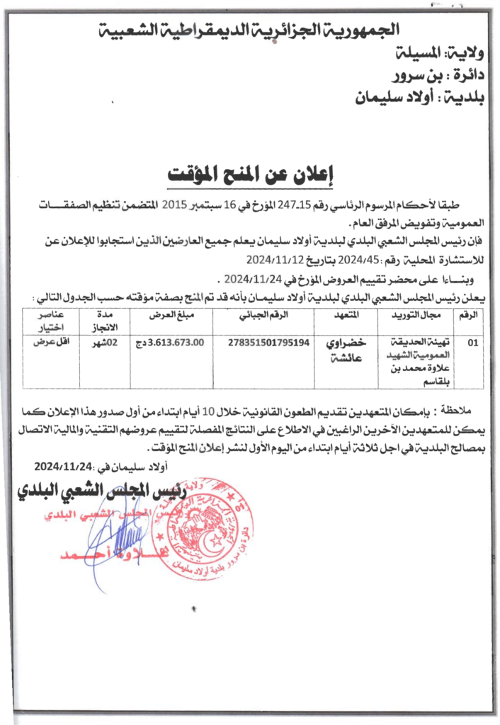إعلان عن المنح المؤقت تهيئة الحديقة العمومية الشهيد علاوة محمد بن بلقاسم/ بلدية أولاد سليمان