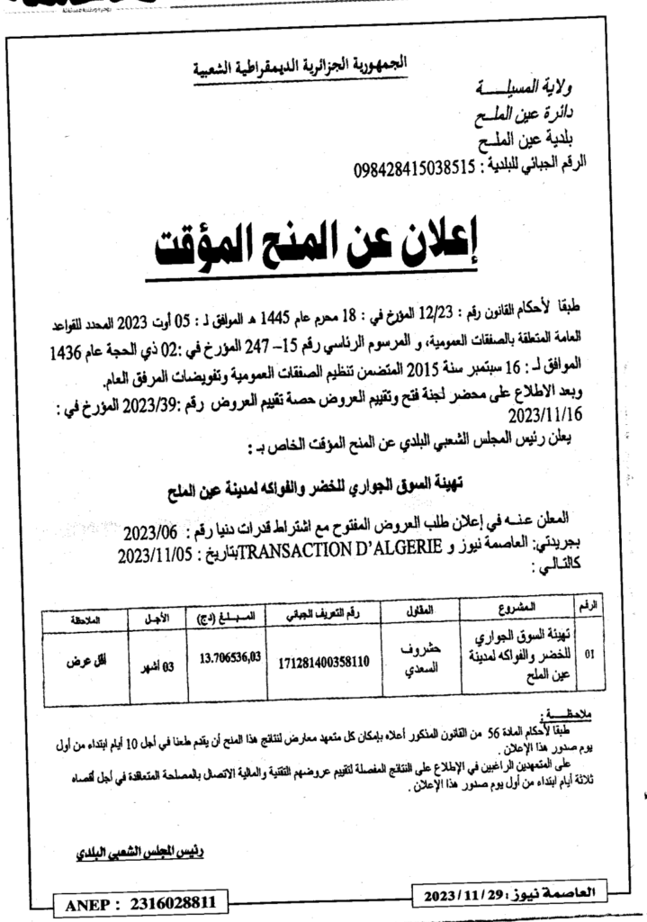 إعلان عن المنح المؤقت: تهيئة السوق الجواري للخضر والفواكه لبلدية عين الملح