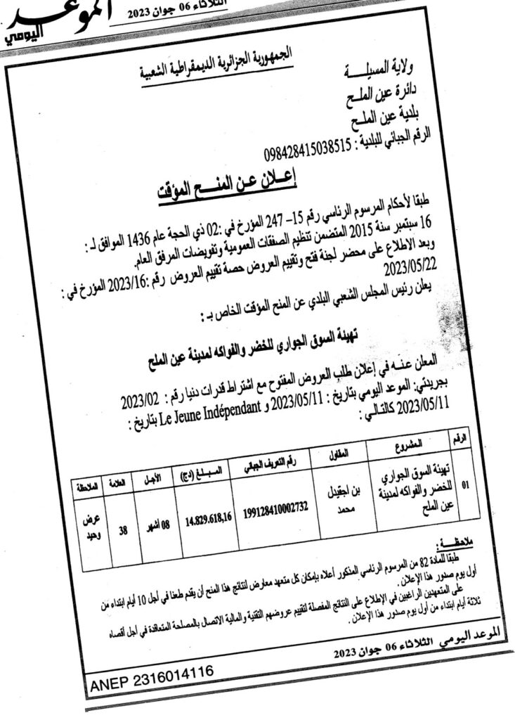 إعلان عن المنح المؤقت: تهيئة السوق الجواري للخضر والفواكه لمدينة عين الملح