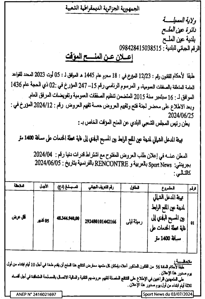 إعلان عن المنح المؤقت تهيئة المدخل الشمالي بلدية عين الملح