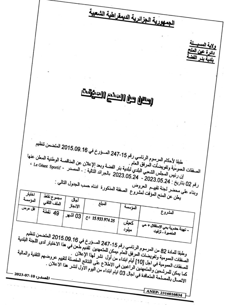 إعلان عن المنح المؤقت: تهيئة حضرية بحي الاستقلال، المنصيرة – تزفيت بلدية بئر الفضة