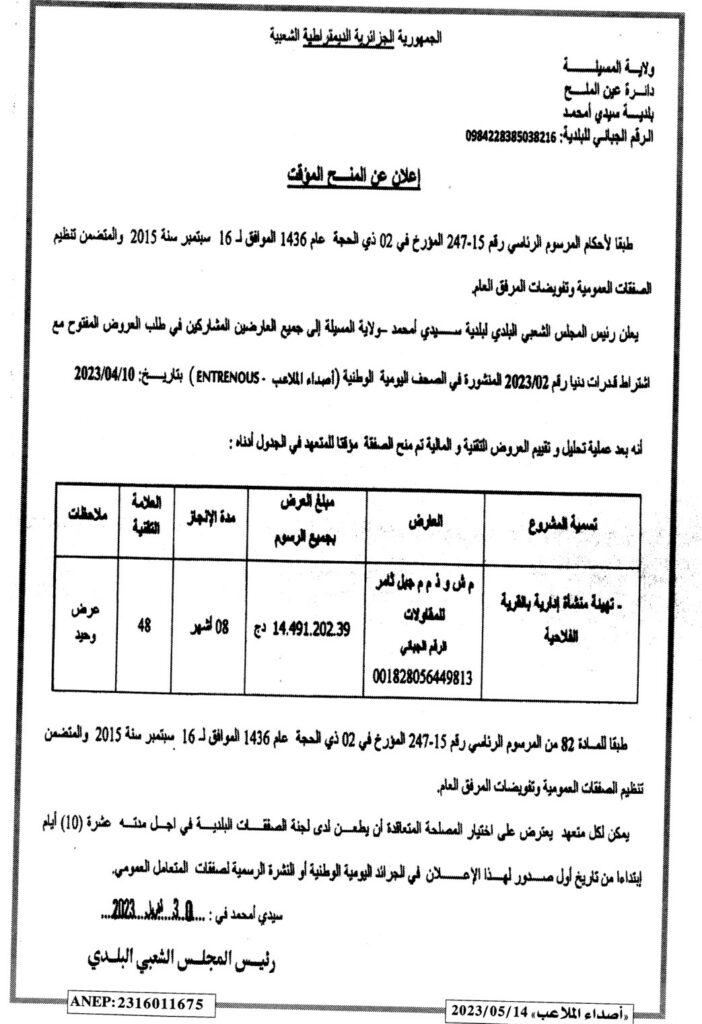 إعلان عن المنح المؤقت: تهيئة منشأة إدارية بالقرية الفلاحية بلدية سيدي امحمد