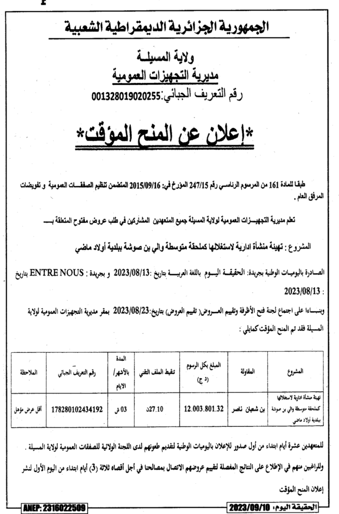 إعلان عن المنح المؤقت: تهيئة منشأة ادارية لاستغلالها كملحقة متوسطة والي بن صوشة ببلدية أولاد ماضي/ مديرية التجهيزات العمومية لولاية المسيلة