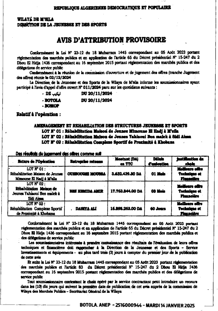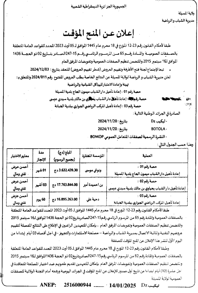إعلان عن المنح المؤقت تهيئة وإعادة الإعتبار للهياكل الشبانية والرياضية/ مديرية الشباب والرياضة لولاية المسيلة