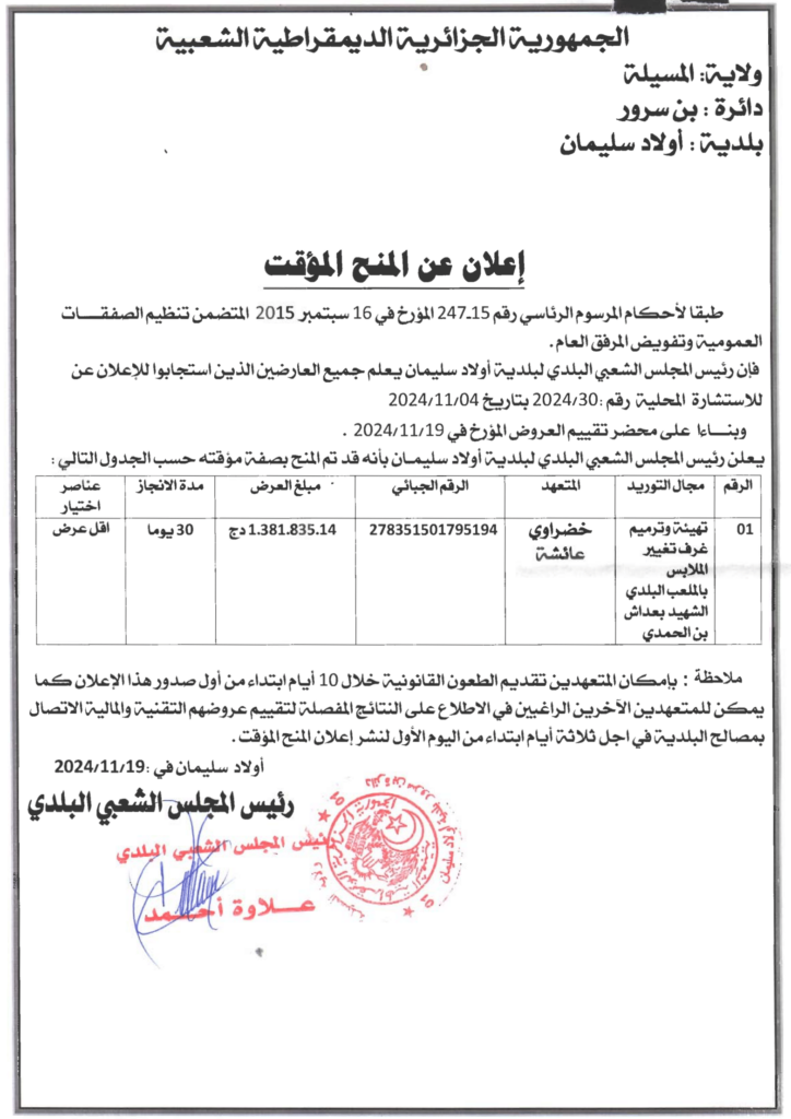 إعلان عن المنح المؤقت تهيئة وترميم غرف تغيير الملابس بالملعب البلدي/ بلدية أولاد سليمان