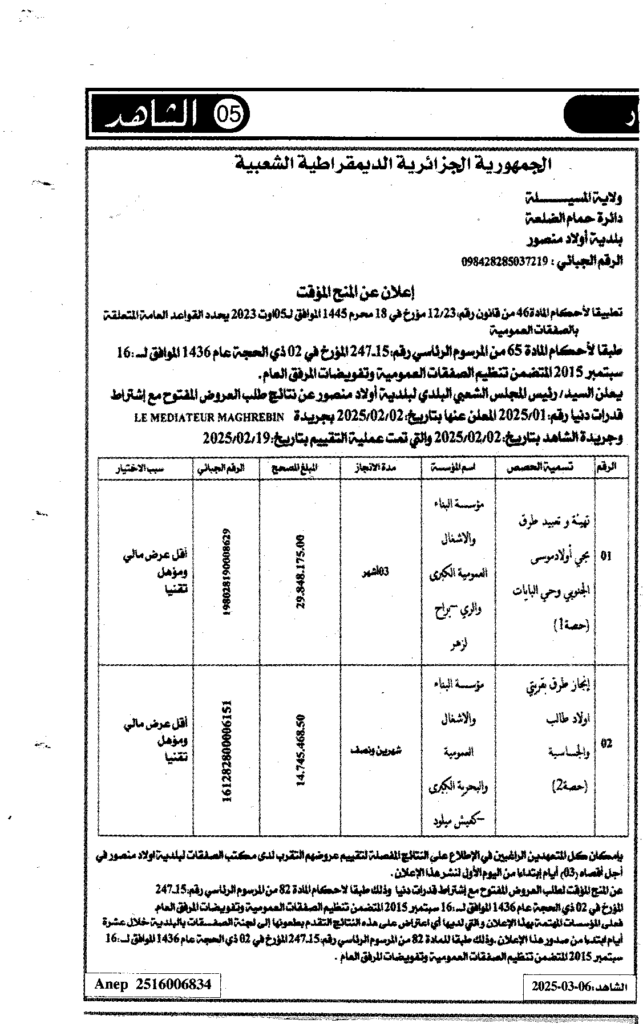 إعلان عن المنح المؤقت تهيئة وتعبيد الطرق ببلدية أولاد منصور