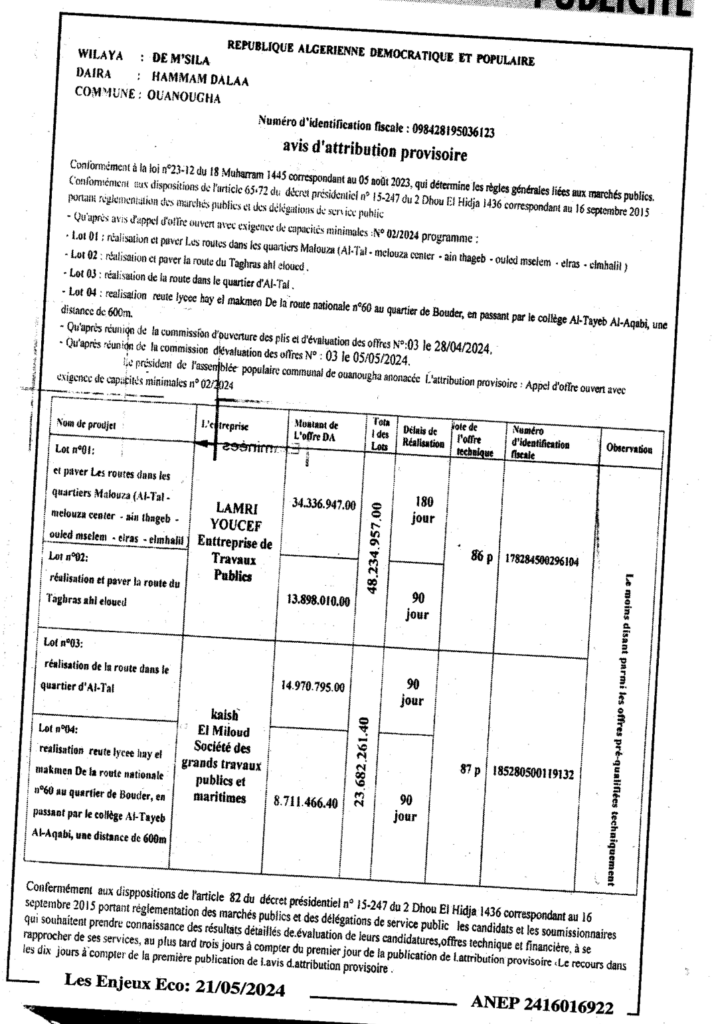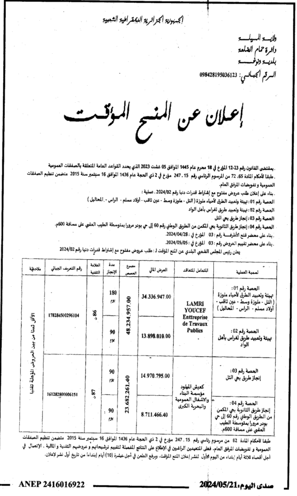 إعلان عن المنح المؤقت تهيئة وتعبيد وانجاز الطرق ببلدية ونوغة