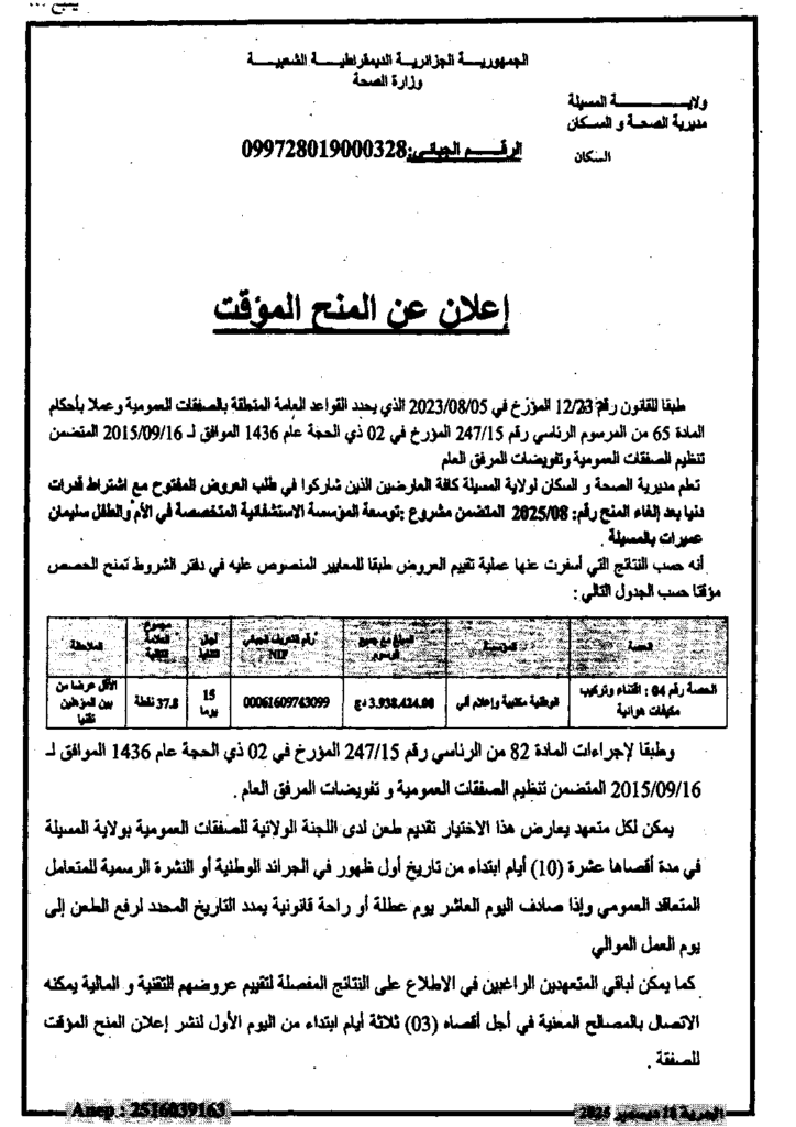 إعلان عن المنح المؤقت توسعة المؤسسة الاستشفائية المتخصصة في الأم والطفل المسيلة/ مديرية الصحة والسكان لولاية المسيلة