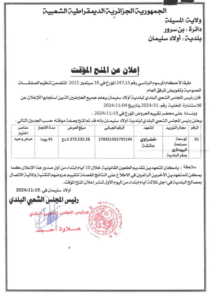 إعلان عن المنح المؤقت توسعة مصلحة البيومتري بمقر البلدية/ بلدية أولاد سليمان