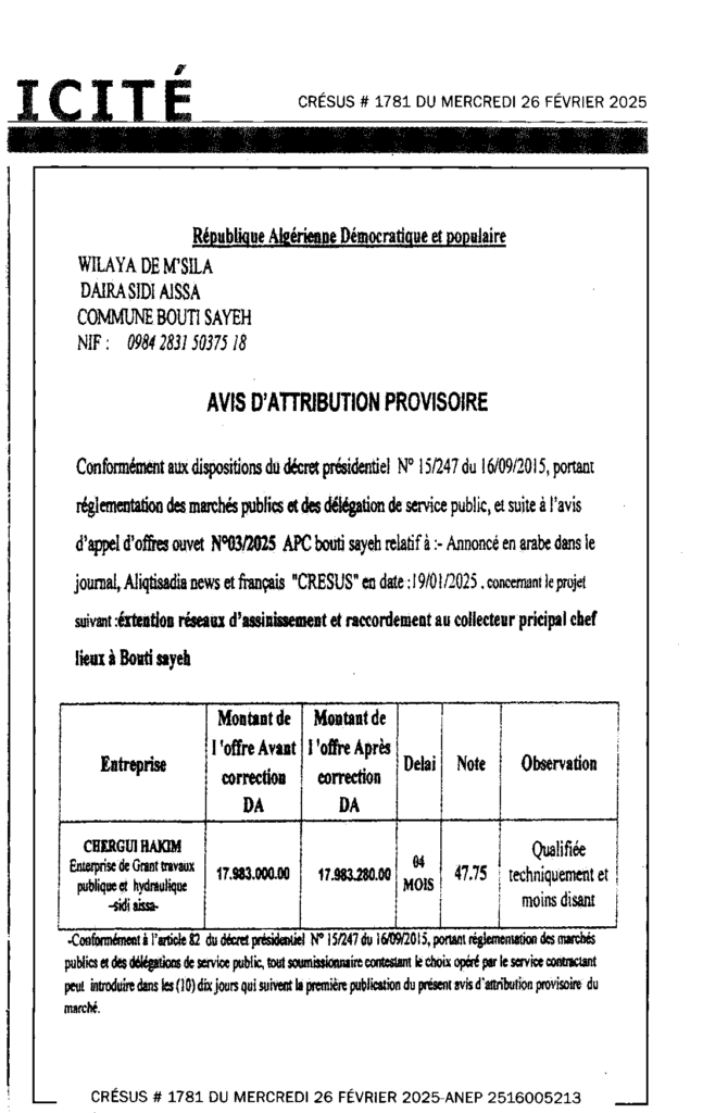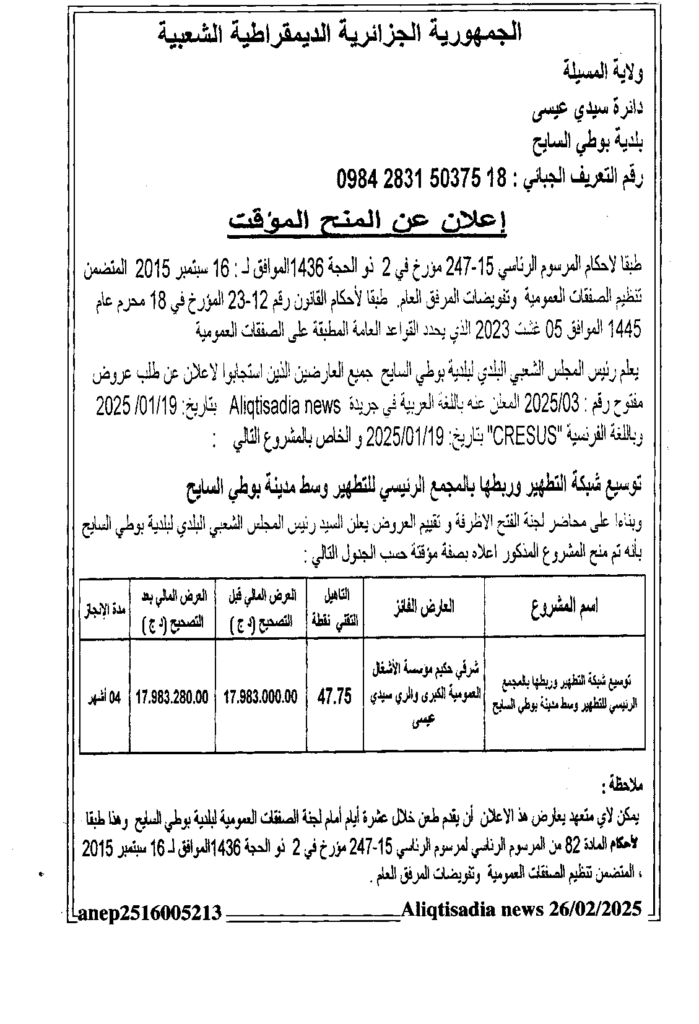 إعلان عن المنح المؤقت توسيع شبكة التطهير وربطها بالمجمع الرئيسي للتطهير وسط مدينة بوطي السايح