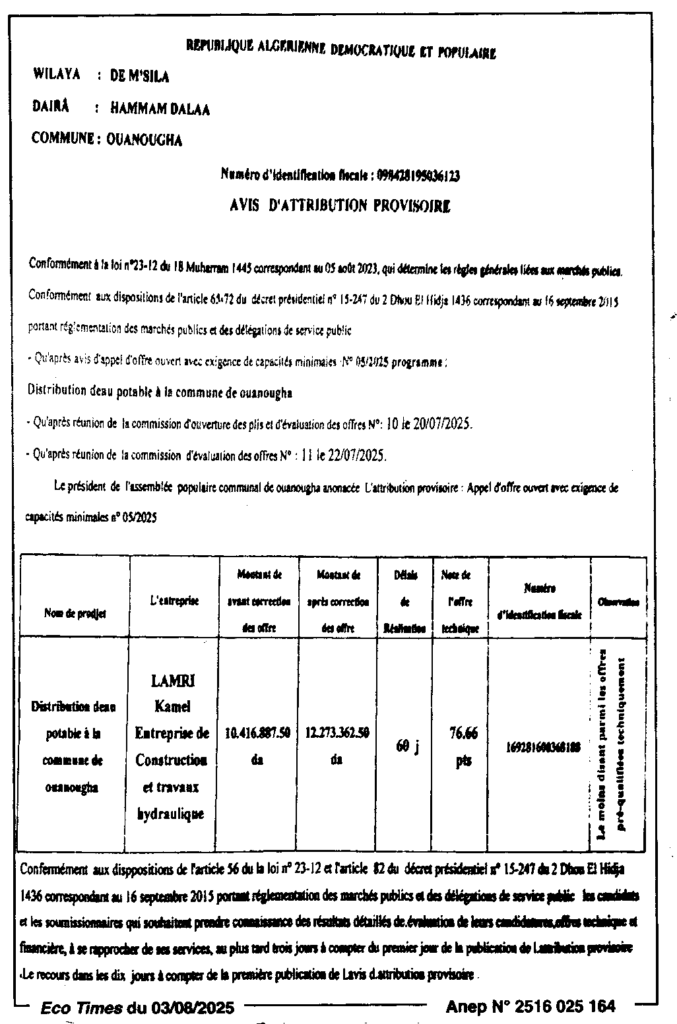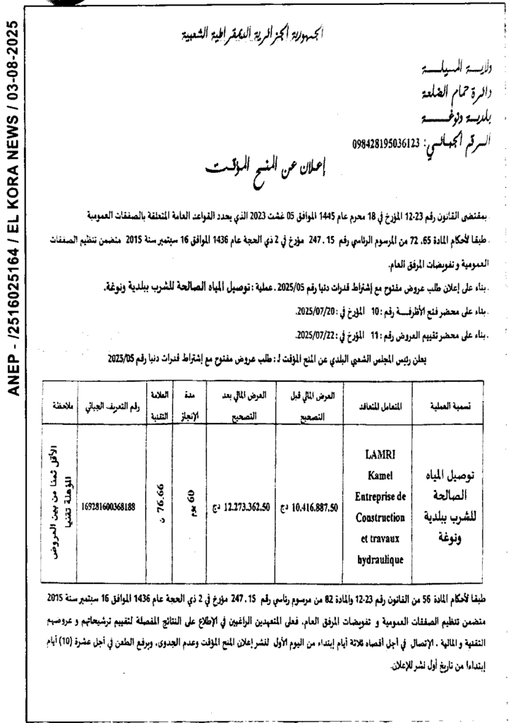 إعلان عن المنح المؤقت توصيل المياه الصالحة للشرب/ بلدية ونوغة