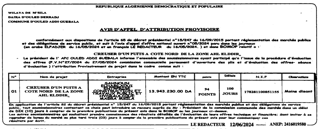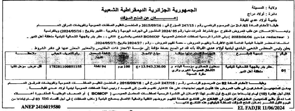 إعلان عن المنح المؤقت حفر بئر بالجهة الشمالية لبلدية أولاد عدي لقبالة