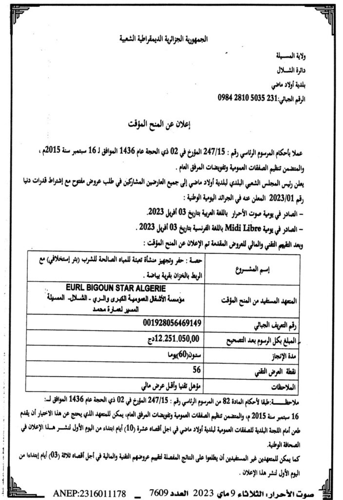 إعلان عن المنح المؤقت: حفر وتجهيز منشأة تعبئة المياه الصالحة للشرب (بئر استخلافي) مع الربط بالخزان بقرية بياضة بلدية أولاد ماضي