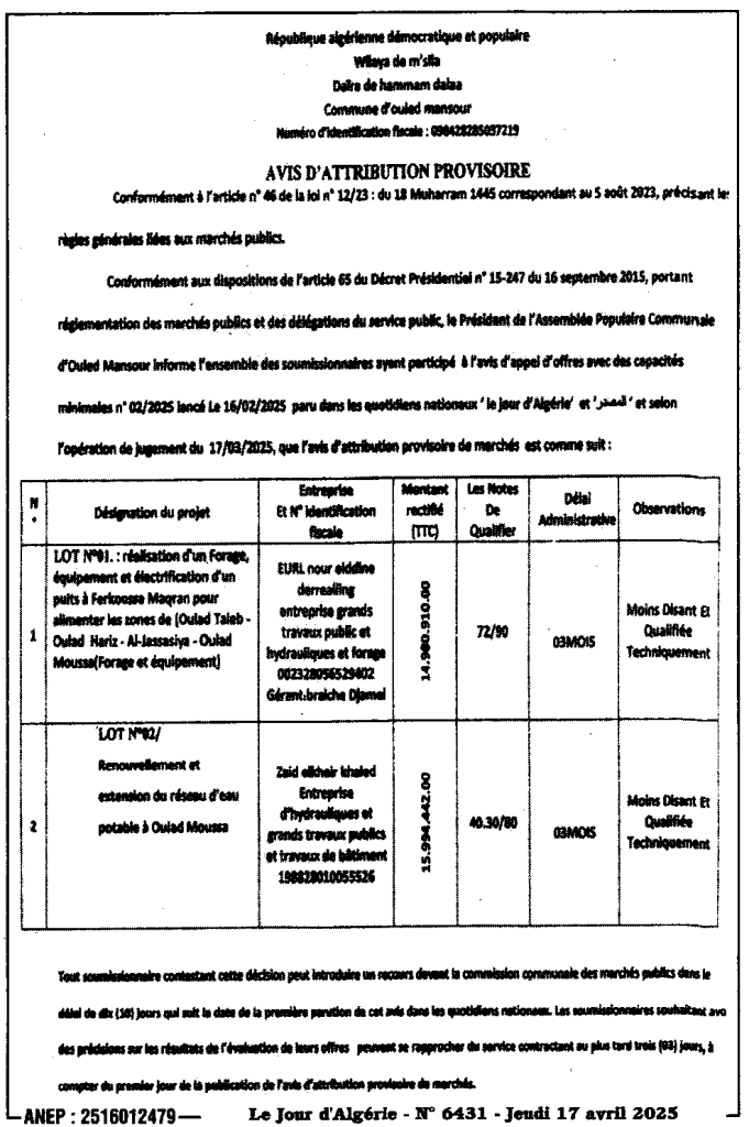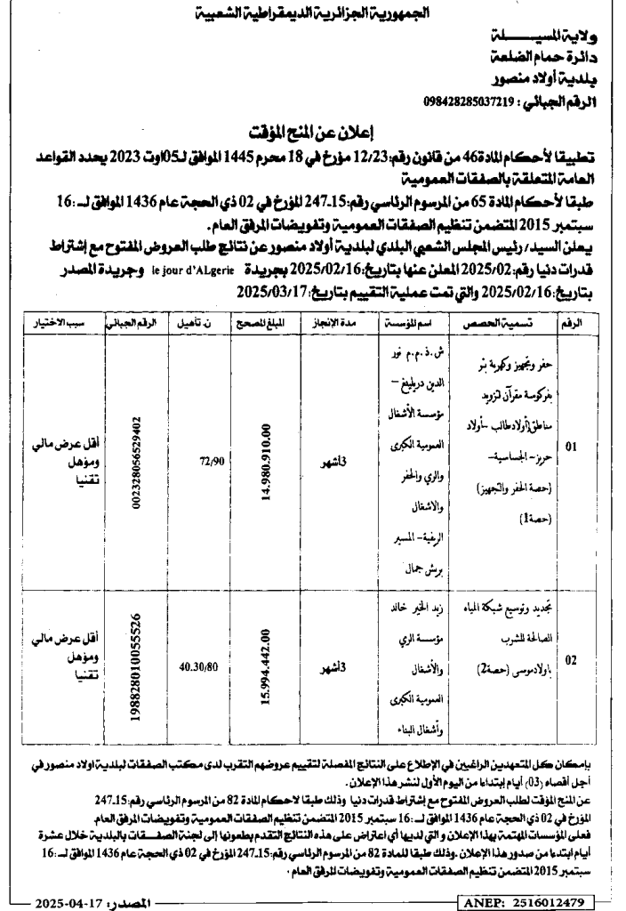 إعلان عن المنح المؤقت حفر وتجهيز وكهربة بئر وتجديد وتوسيع شبكة المياه الصالحة للشرب/ بلدية أولاد منصور
