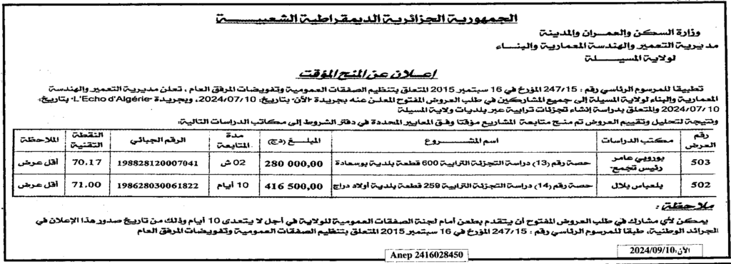إعلان عن المنح المؤقت دراسة انشاء تجزئات ترابية عبر بلديات ولاية المسيلة/ مديرية التعمير والهندسة المعمارية والبناء لولاية المسيلة