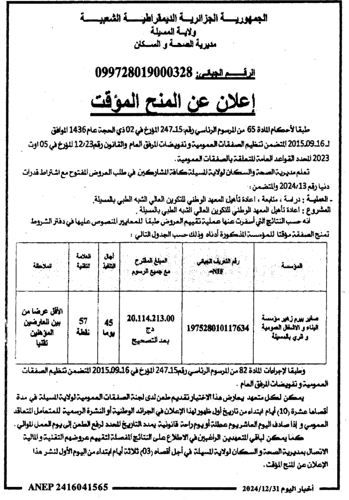 إعلان عن المنح المؤقت دراسة متابعة اعادة تأهيل المعهد الوطني للتكوين العالي الشبه الطبي بالمسيلة/ مديرية الصحة والسكان لولاية المسيلة