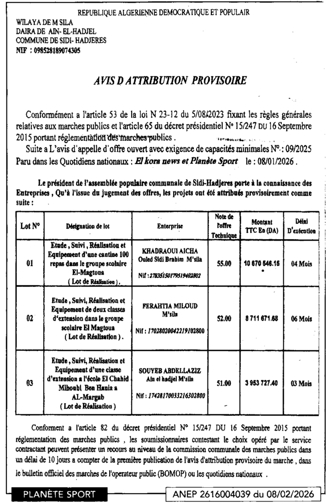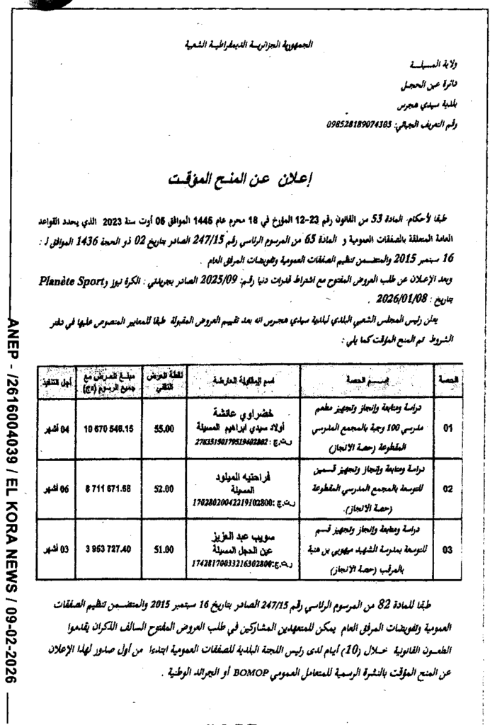 إعلان عن المنح المؤقت دراسة متابعة انجاز وتجهيز مطعم مدرسي وقسمين/ بلدية سيدي هجرس