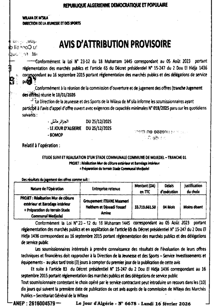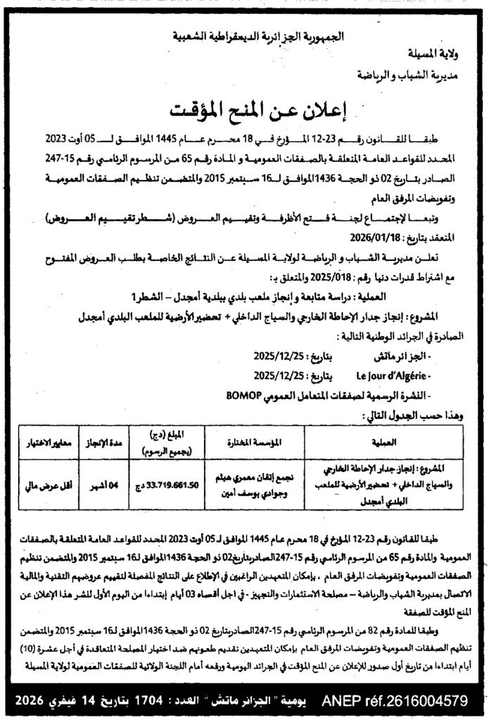 إعلان عن المنح المؤقت دراسة متابعة وانجاز ملعب بلدية ببلدية امجدل/ مديرية الشباب والرياضة لولاية المسيلة