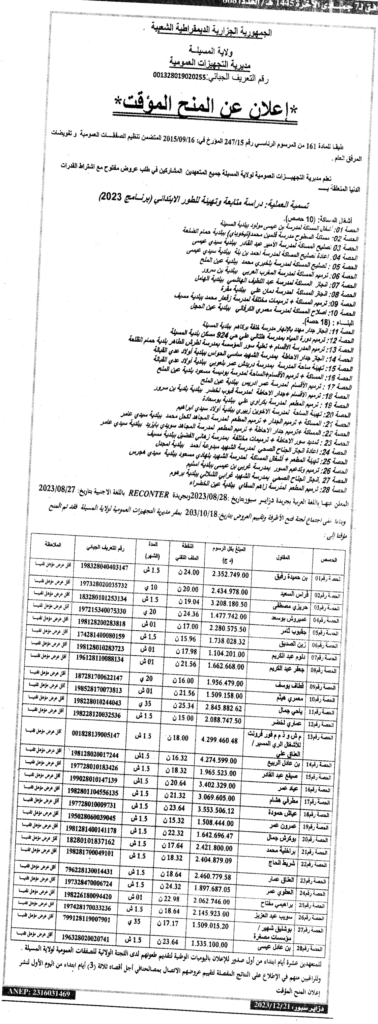 إعلان عن المنح المؤقت: دراسة متابعة وتهيئة الطور الابتدائي (برنامج 2023) مديرية التجهيزات العمومية لولاية المسيلة