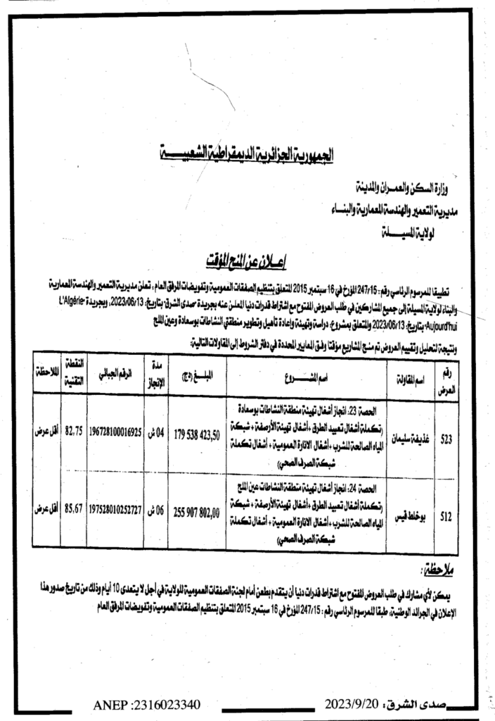 إعلان عن المنح المؤقت: دراسة وتهيئة وإعادة تأهيل وتطوير منطقتي النشاطات بوسعادة وعين الملح/ مديرية التعمير والهندسة المعمارية والبناء لولاية المسيلة