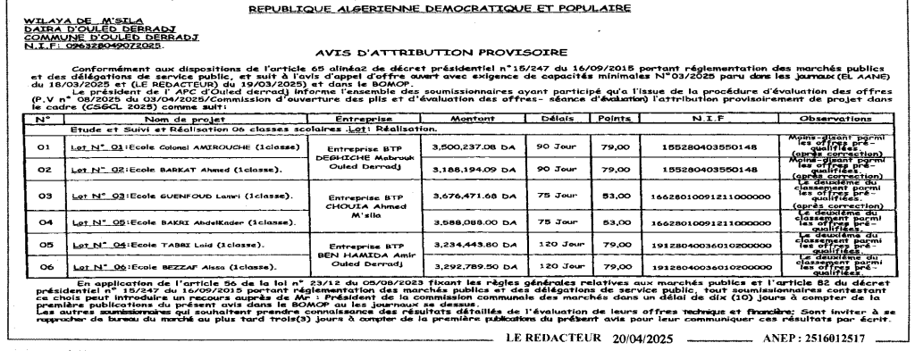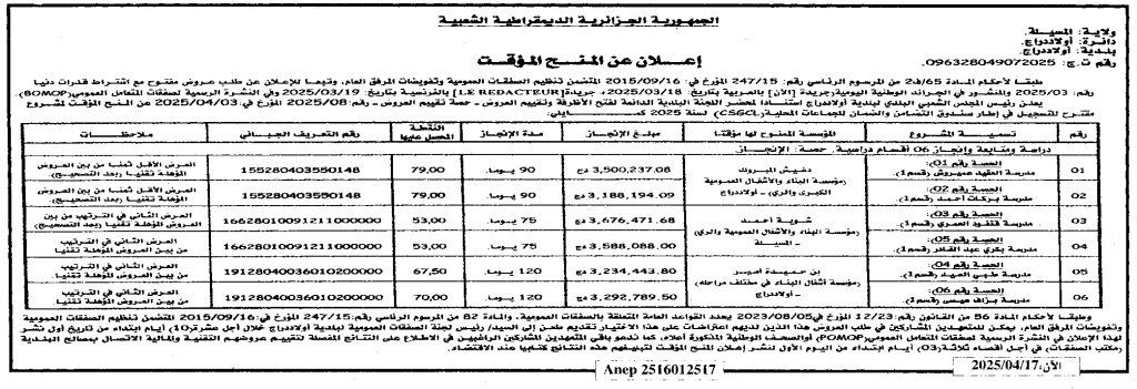 إعلان عن المنح المؤقت دراسة ومتابعة وانجاز 06 أقسام دراسية/ بلدية أولاد دراج