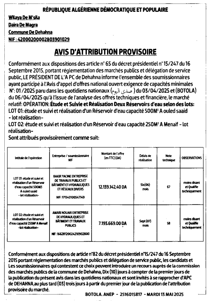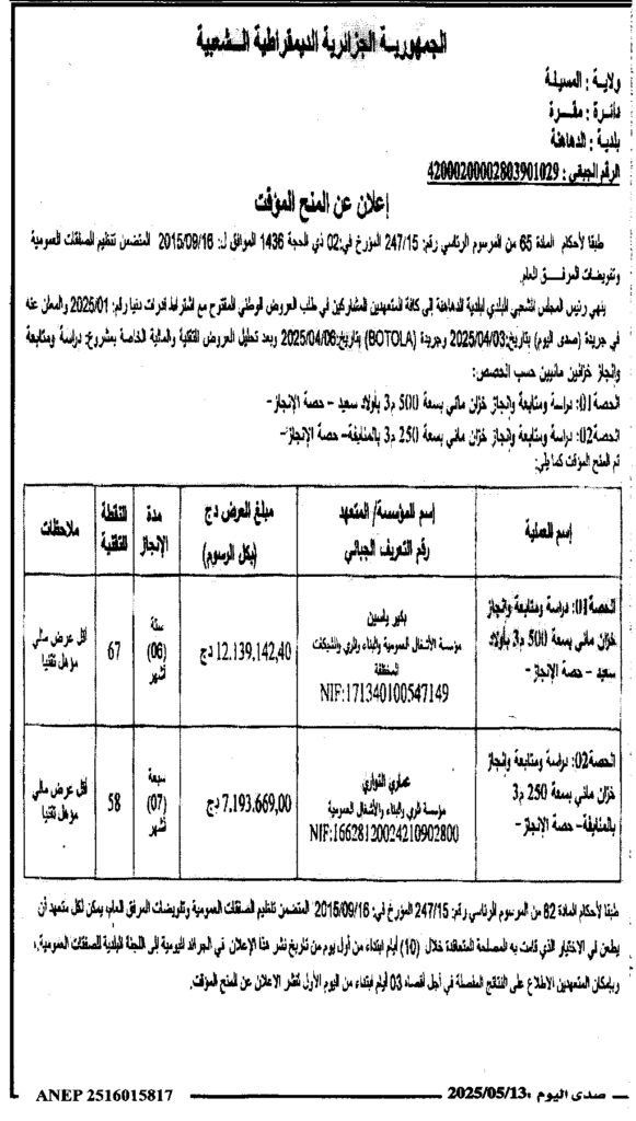 إعلان عن المنح المؤقت دراسة ومتابعة وانجاز خزانيين مائيين/ بلدية الدهاهنة